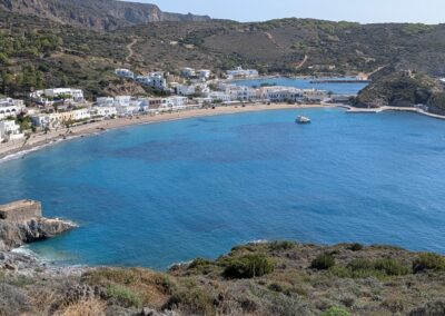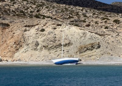 Der letzte Stop vor Kreta ist die Helatros Bucht im Süden der kleinen Insel Kasos, wo seit Jahren ein gestrandetes Schiff auf dem Strand liegt…eine Warnung dass man nie 100% sicher ist. Wir werden damit heute wohl kein Problem haben, es bläst kräftig ablandig, und der Ankergrund ist gut.