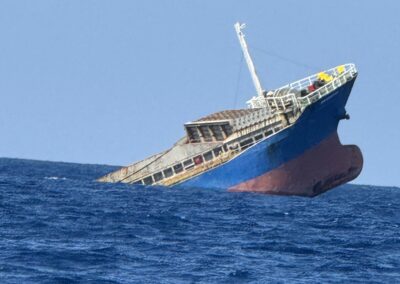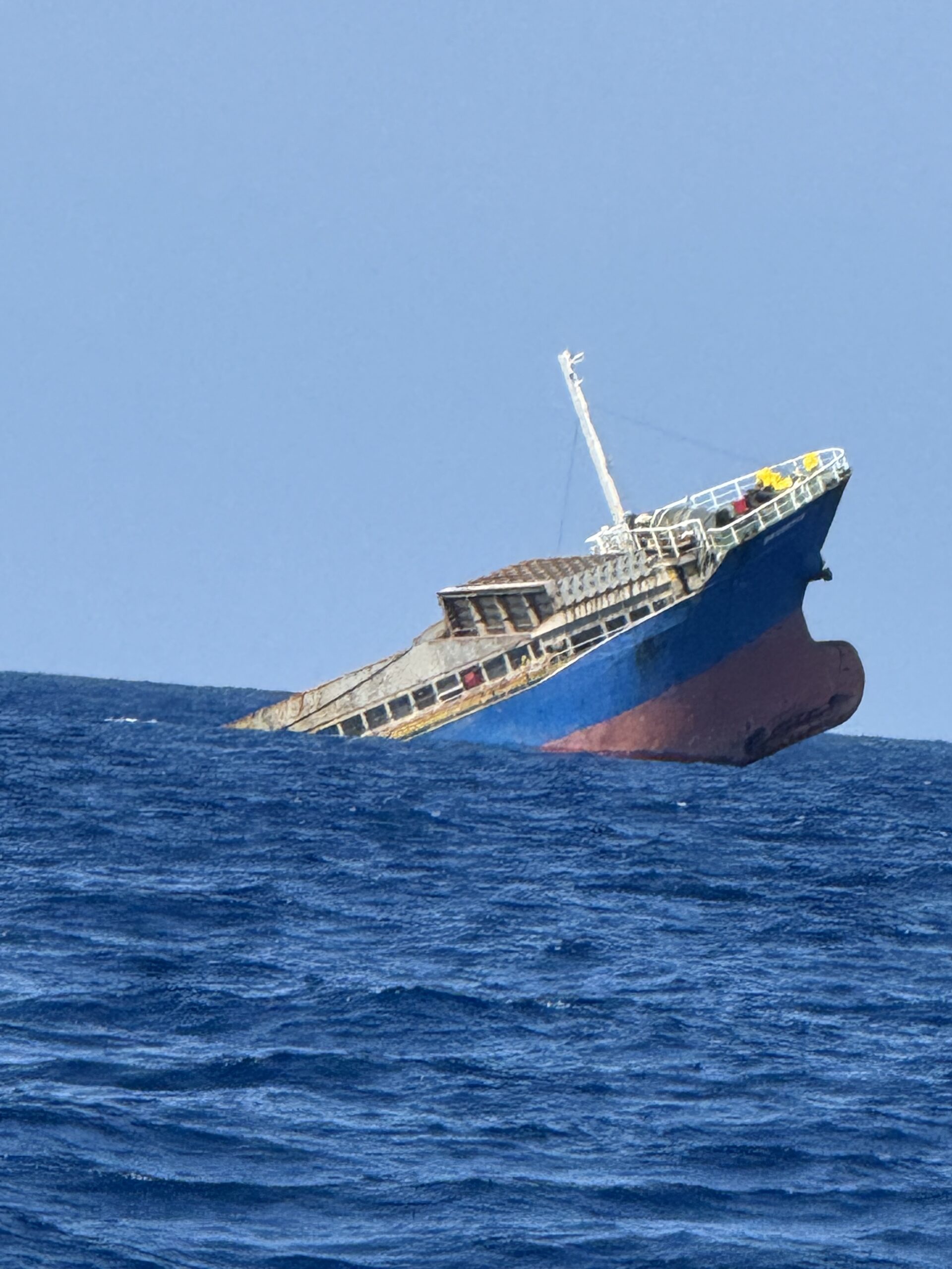 Wir haben einen Anlieger (also hoch am Wind, ohne aber kreuzen zu müssen) auf den 42 Meilen rüber nach Sitia, der Hafenstadt im Osten von Kreta. Kurz vorher passieren wir ein anderes ‚Seezeichen’, den Frachter MN Kostas, der das Flach voll erwischt hat und dort gesunken ist. Eigentlich unverständlich, denn das Flach ist schon seit Jahren dort….