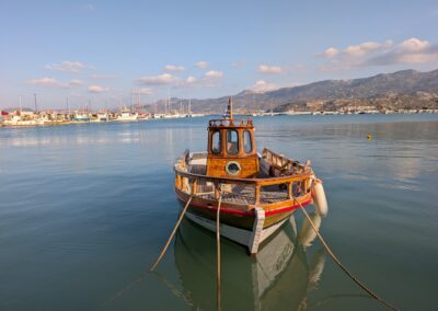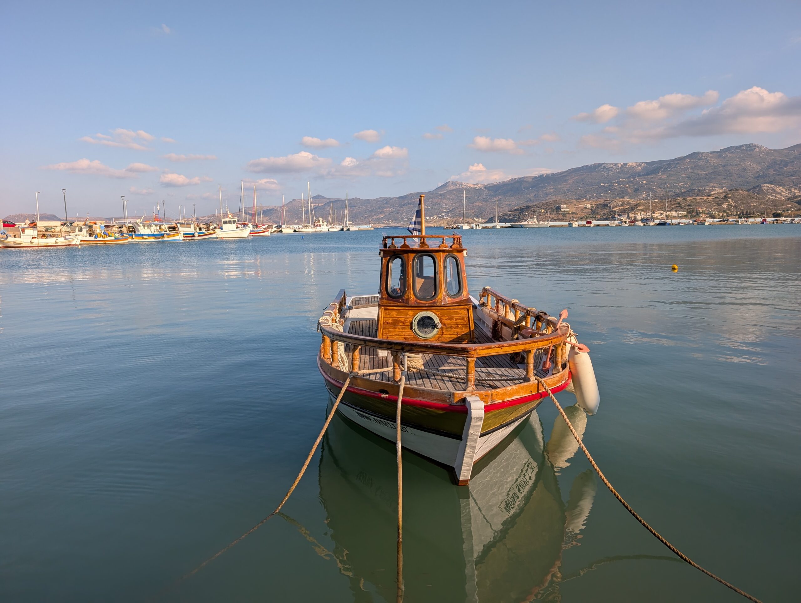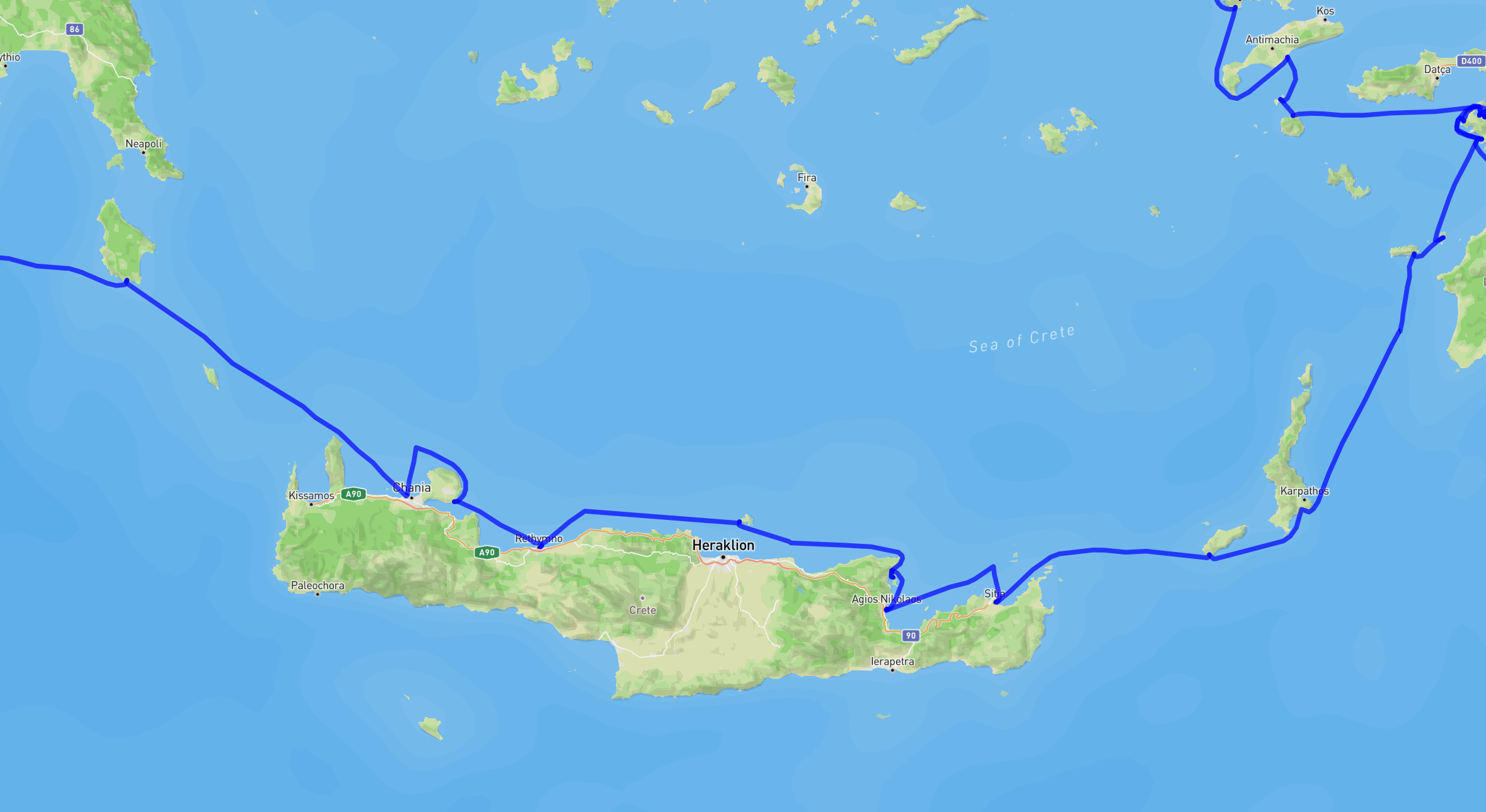 Am nächsten Tag – wir fahren von Spinalonga Richtig Westen – spüren wir, wieso Kreta kein schönes Segelrevier ist: Kreta liegt wie eine Barriere quer von West nach Ost unterhalb der Ägäis. Vorherrschender Wind aus Norden treibt die Wellen vor sich her, die von der Insel reflektiert werden und eine unangenehme, kurze und steile Dünung verursacht. Entsprechend ruppig ist die Fahrt. Wir übernachten auf Dio, nördlich von Heraklion, einer der wenigen Plätze die Schutz vor dem Nordwind bietet, bevor wir nach Rethymno weitersegeln. Hier ist nochmal Hafenliegen angesagt – natürlich wieder in der Einfahrt (‚kein Platz für Multihulls‘) an einer rauhen Mauer. Zum Glück sind ruhige Bedingungen.