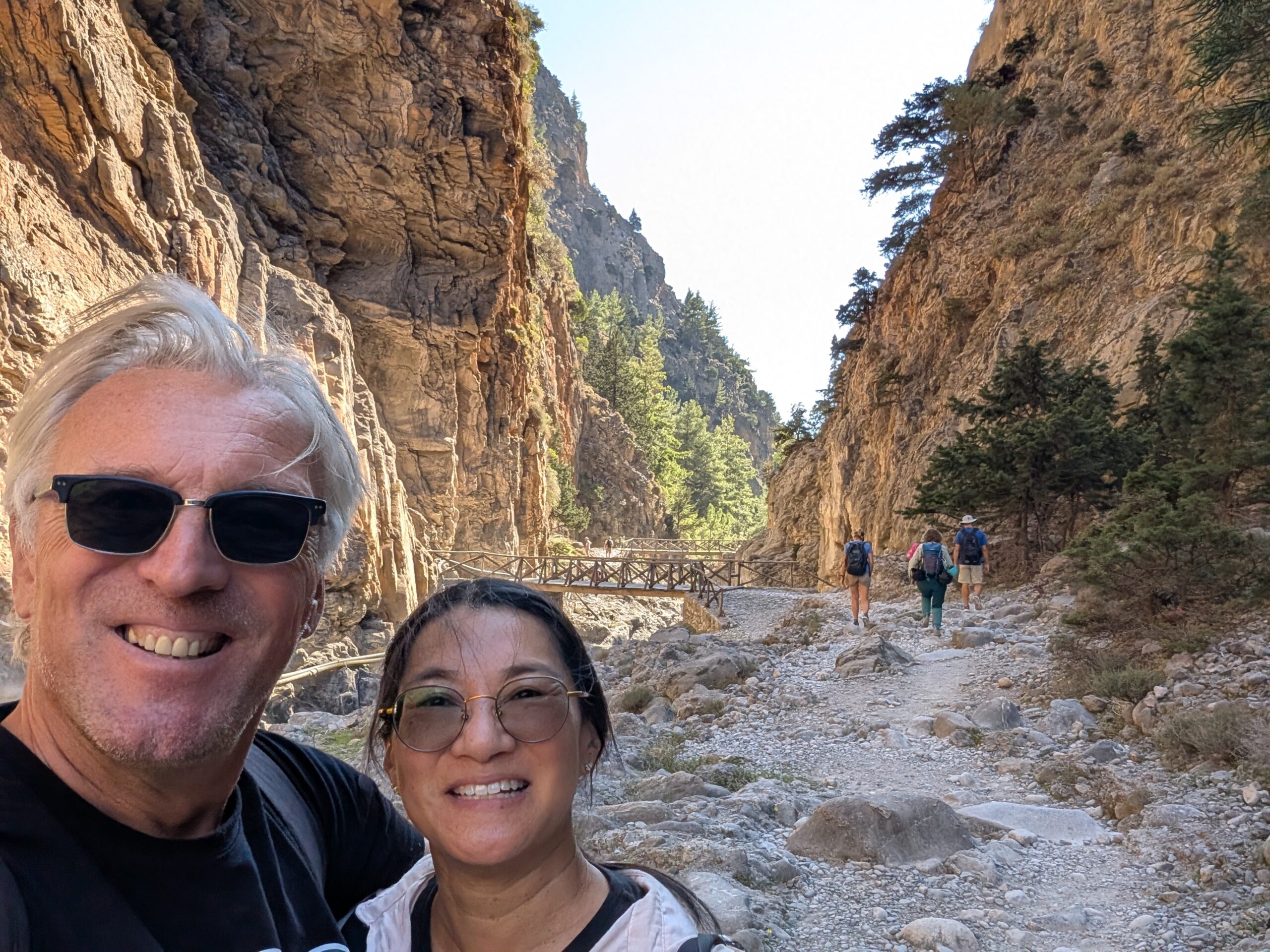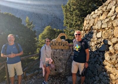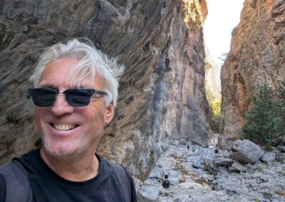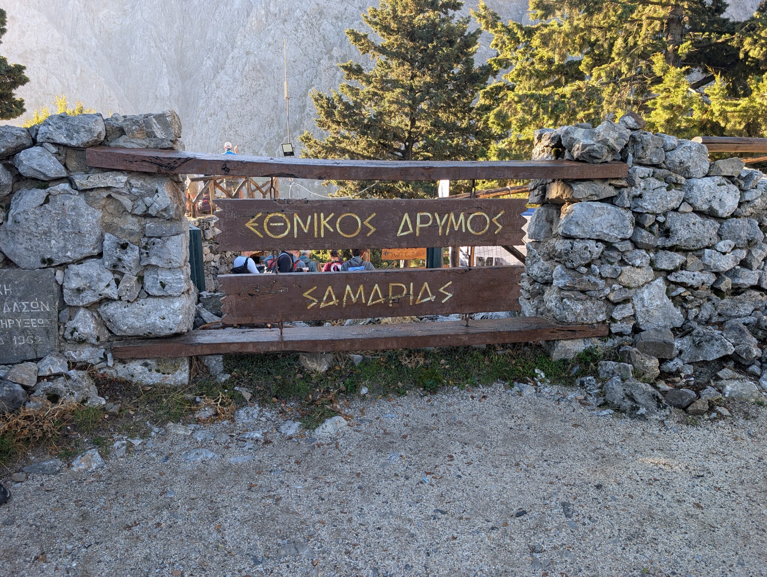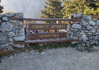 Wir bleiben ein paar Tage…eine Schneiderin vor Ort verpasst der Nationalen mal einen neuen Saum und einer Jacke einen neuen Reißverschluss. Und wir machen mit Rob und Fiona den Samaria-Gorge, eine Wanderung durch eine der längsten Schluchten Europas (17km). Mit dem Bus werden wir zum Startpunkt gebracht, der Einstieg ist steil und es geht über Stock und Stein. Für die ersten 6 km brauchen wir 2 Stunden…gegen Ende wird es flacher, an der schmalsten Stelle (die eiserne Pforte) ist die Schlucht nur 3m breit, aber 300m hoch. Im Winter und Frühjahr ist die Stelle unpassierbar – zu viel Wasser.