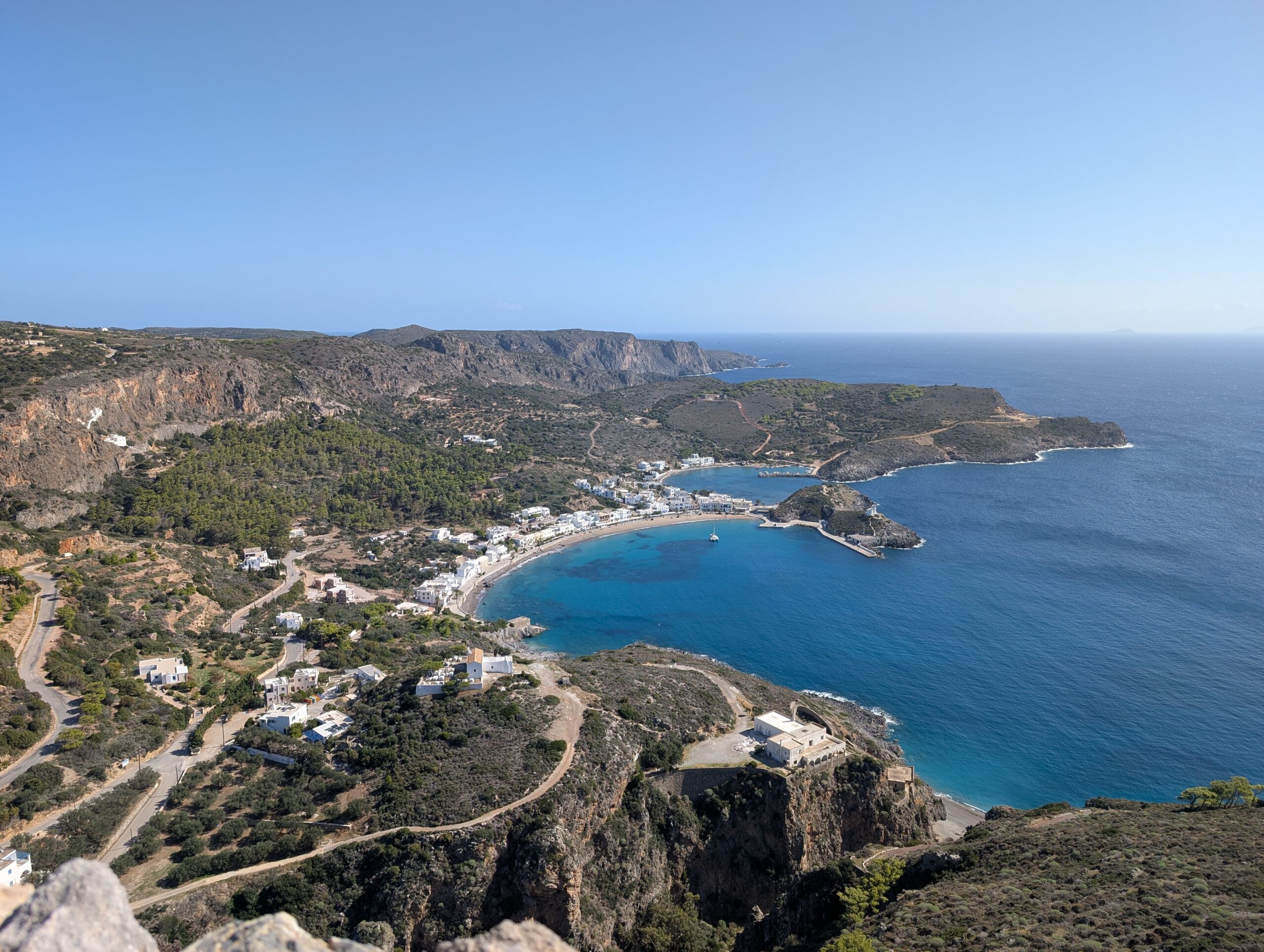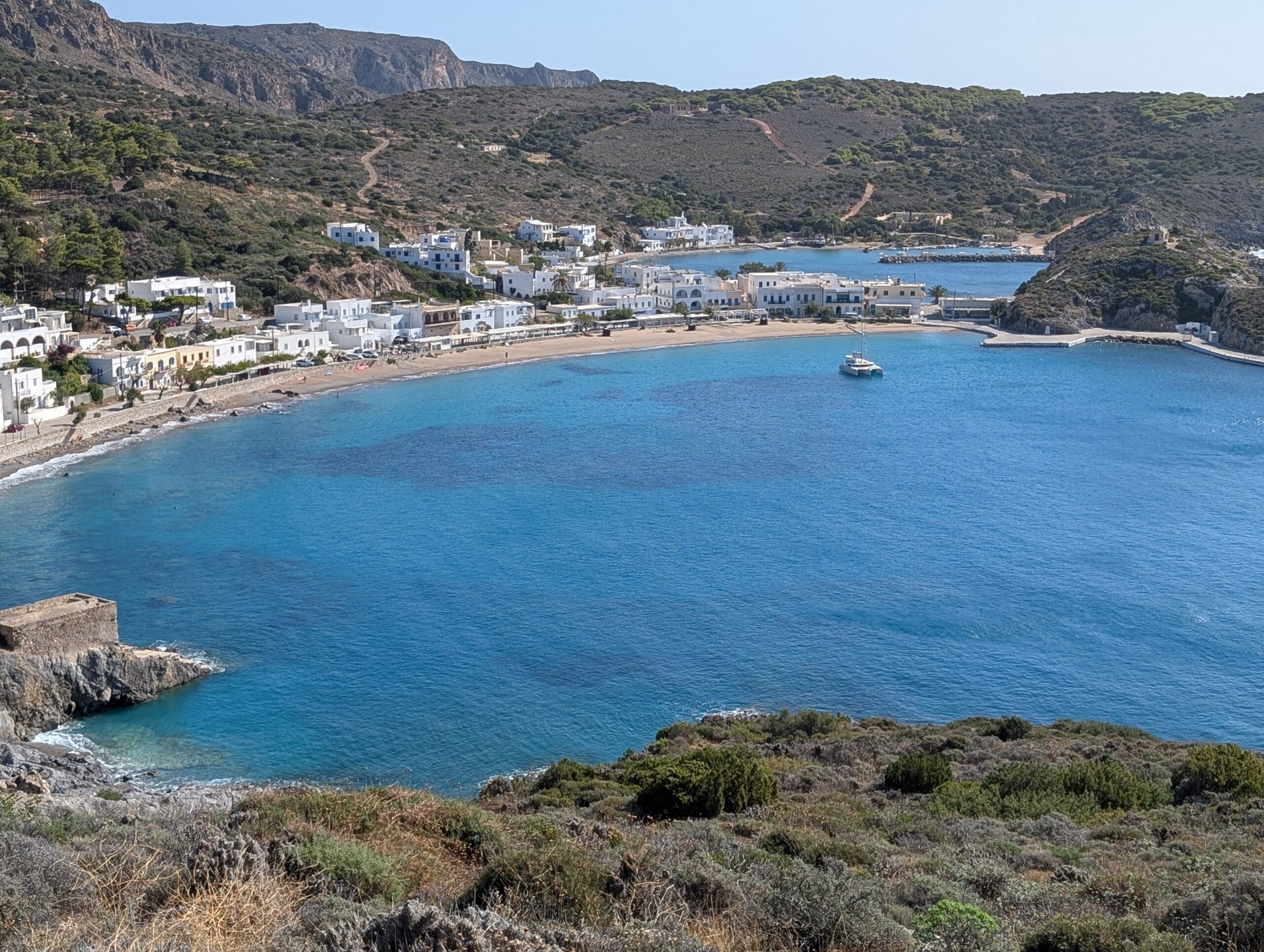 Nach der unangenehmen Erfahrung auf Alimia und der windigen Überfahrt nach Chalki – bei der der Rollenkasten der Stagsegels wieder ausgebrochen ist – machen wir uns auf den Weg nach Karpathos. Zunächst mit Parasailor, bis der Wind weiter auf West dreht, dann mit einem Reff und 50% Genua geht es in die Bucht von Ormos Amorphos, die, obwohl sie ziemlich offen ist, erstaunlich wenig Schwell hat. So kann ich den Rollenkasten neu einsetzen, bevor wir mit dem Beiboot an Land fahren. Mitte Oktober ist bereits Nachsaison, und so ist das Dorf ausgestorben. Bis auf ein Restaurant (Stou Manoli), in dem wir gut Essen und hinterher die Sorbets des Chefs durchprobieren müssen. Es gibt wahrlich Schlimmeres…