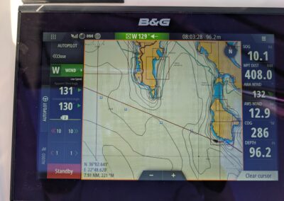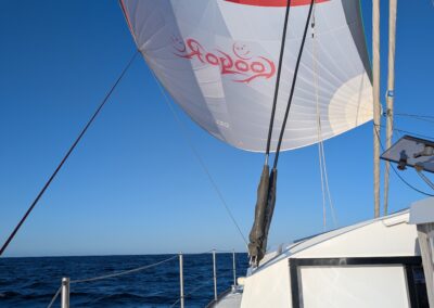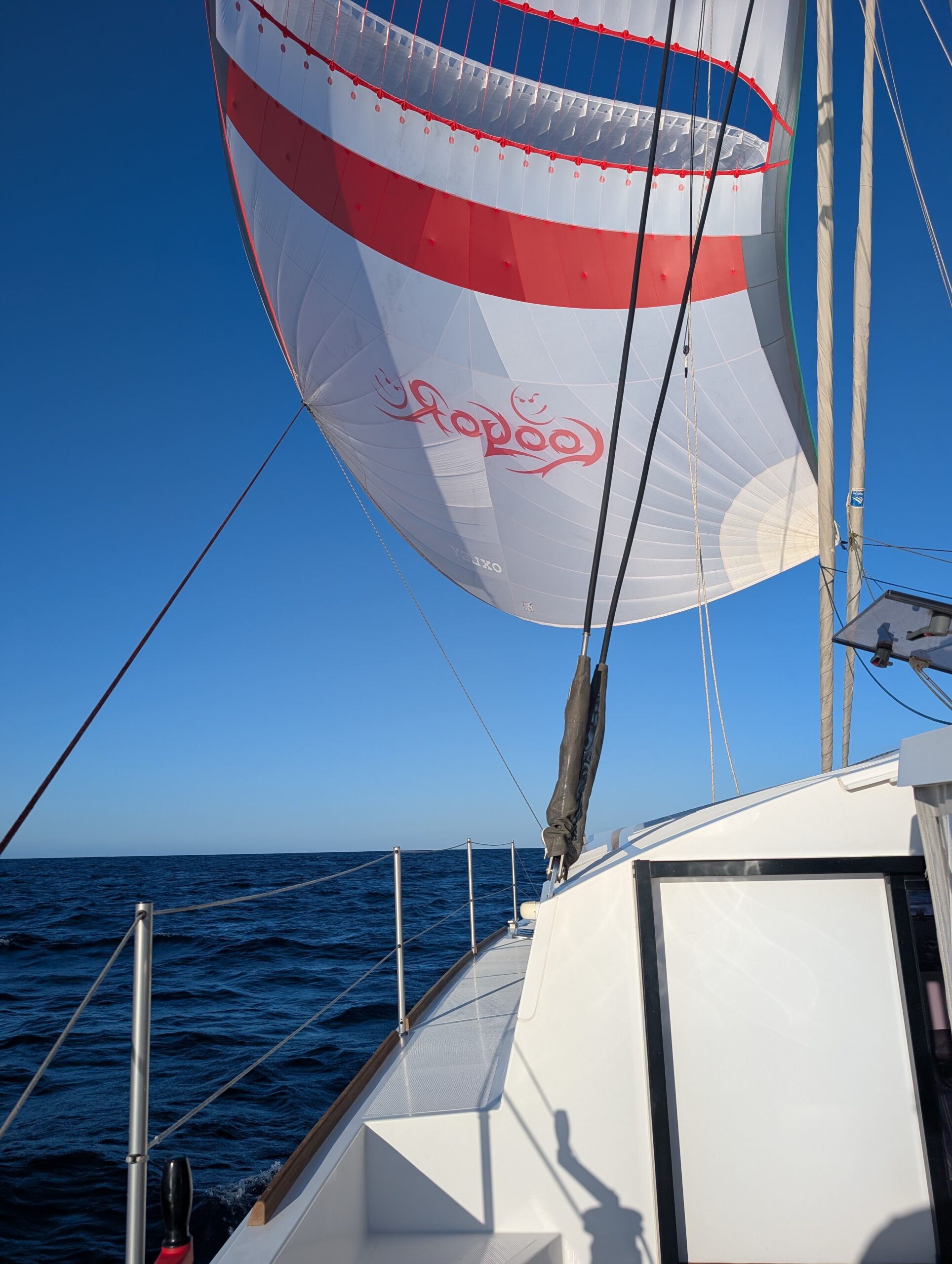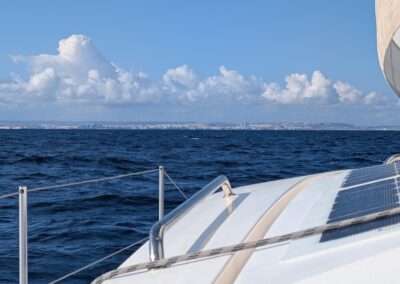 Dann kommt das erste Wetterfenster, welches einigermaßen passt – wenn auch nicht zur Vorhersage. Erst flaches Wasser mit Groß und Gennaker bei Nordost, später dann auf Süd drehend und bis 24kn zunehmend. 2 Reff u Stagsegel, Welle schräg von vorne – ein nasses Vergnügen.