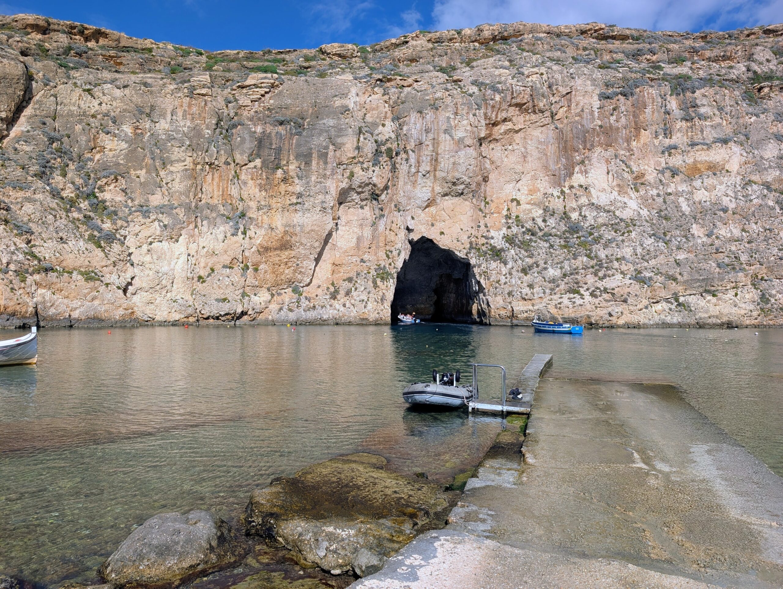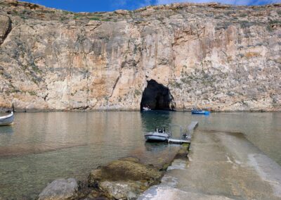 Gozo, die Insel im Norden, ist auch einen Besuch wert: Wir gehen in den Osten in die Bucht von Dwejra, von wo aus man mit dem Beiboot durch einen natürlichen Felsentunnel zu einem Inlandssee kommt. Ansonsten ist die Bucht weder ruhig noch wirklich gut geschützt.